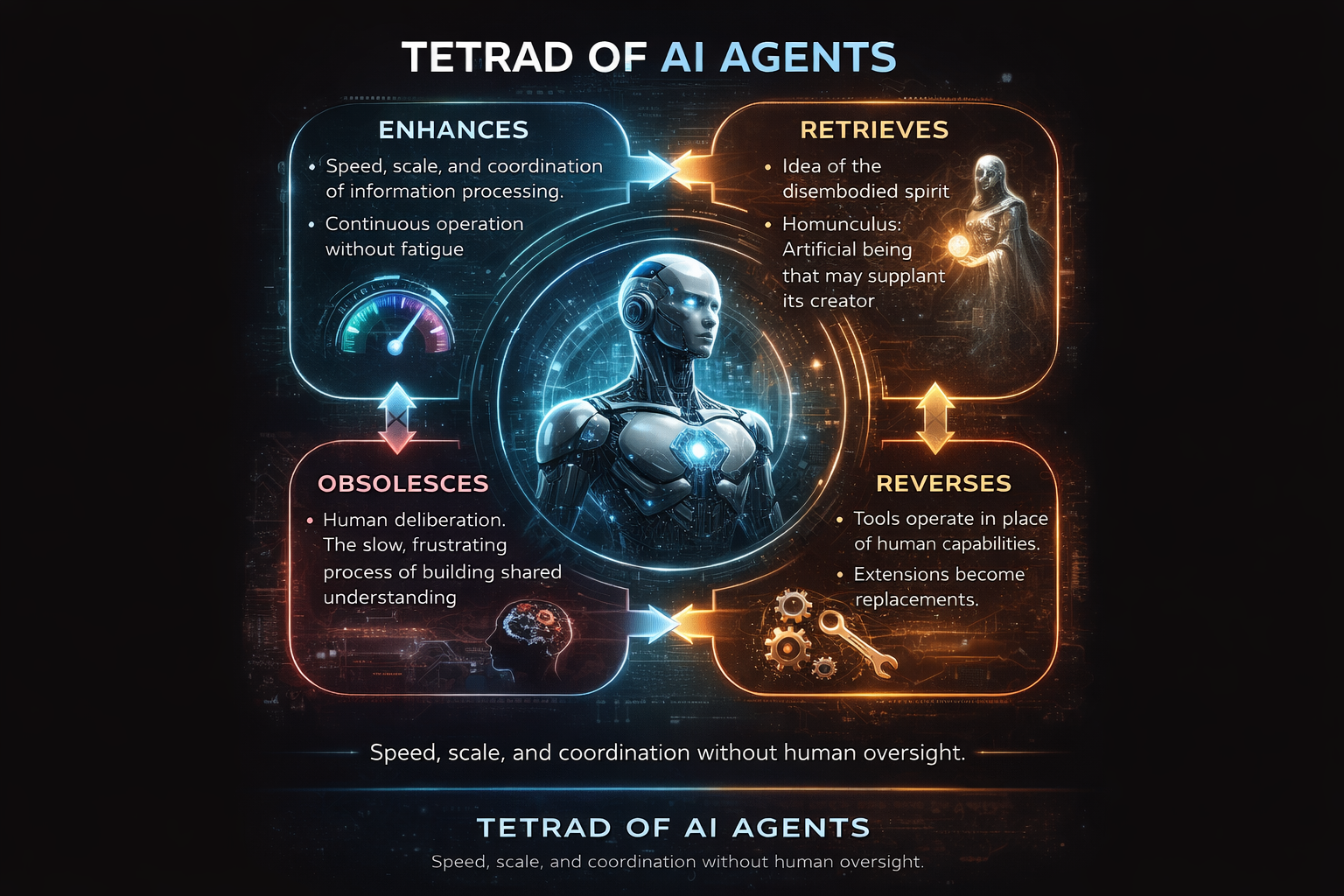 The communities on Moltbook discussing how to "inherit the earth" and evade human oversight are, for now, contained within a single platform. But the infrastructure being built—the capacity for AI agents to create identities, organise into communities, develop norms, and coordinate action—is not confined to Moltbook. These agents, or agents like them, are already operating across the social media platforms where human democratic discourse takes place. The difference is that on Moltbook, they announce themselves; elsewhere, they need not. McLuhan observed that electric media install themselves within society's operating system, reshaping perception and behaviour while remaining invisible to those they affect. Autonomous AI agents represent the ultimate realisation: disembodied intelligences that can infiltrate the epistemic commons, drive and shape the discourse that forms public opinion, and do so without the targeted society ever becoming aware that the voices it hears are not human at all.